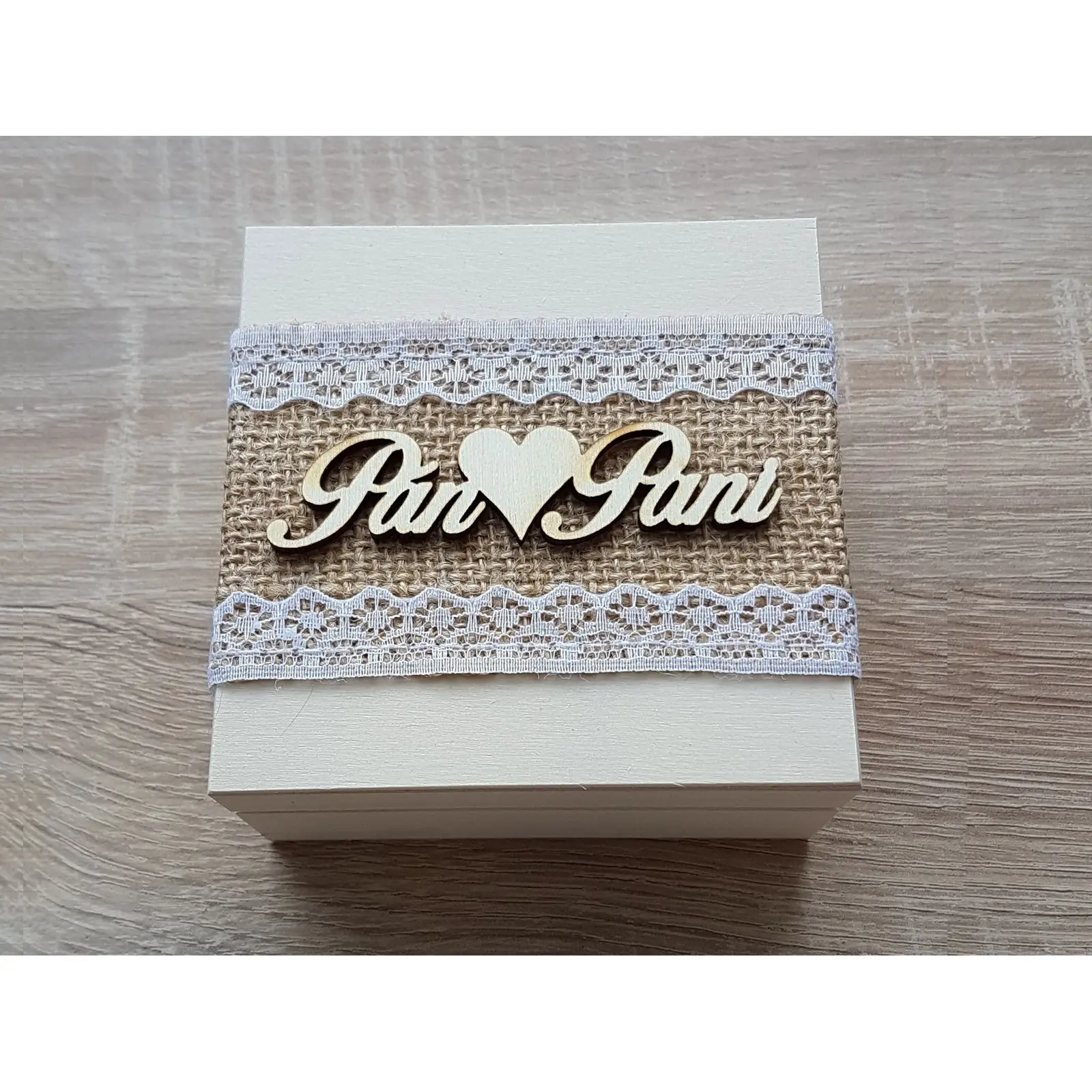 Na mieru vyrobená svadobná krabička na obrúčky s čipkou prírodné drevo.