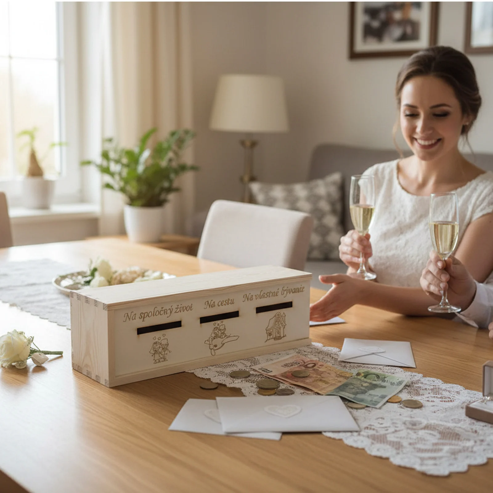 - Sentimentálna hodnota: Pokladnička sa stane krásnou spomienkou na svadbu.