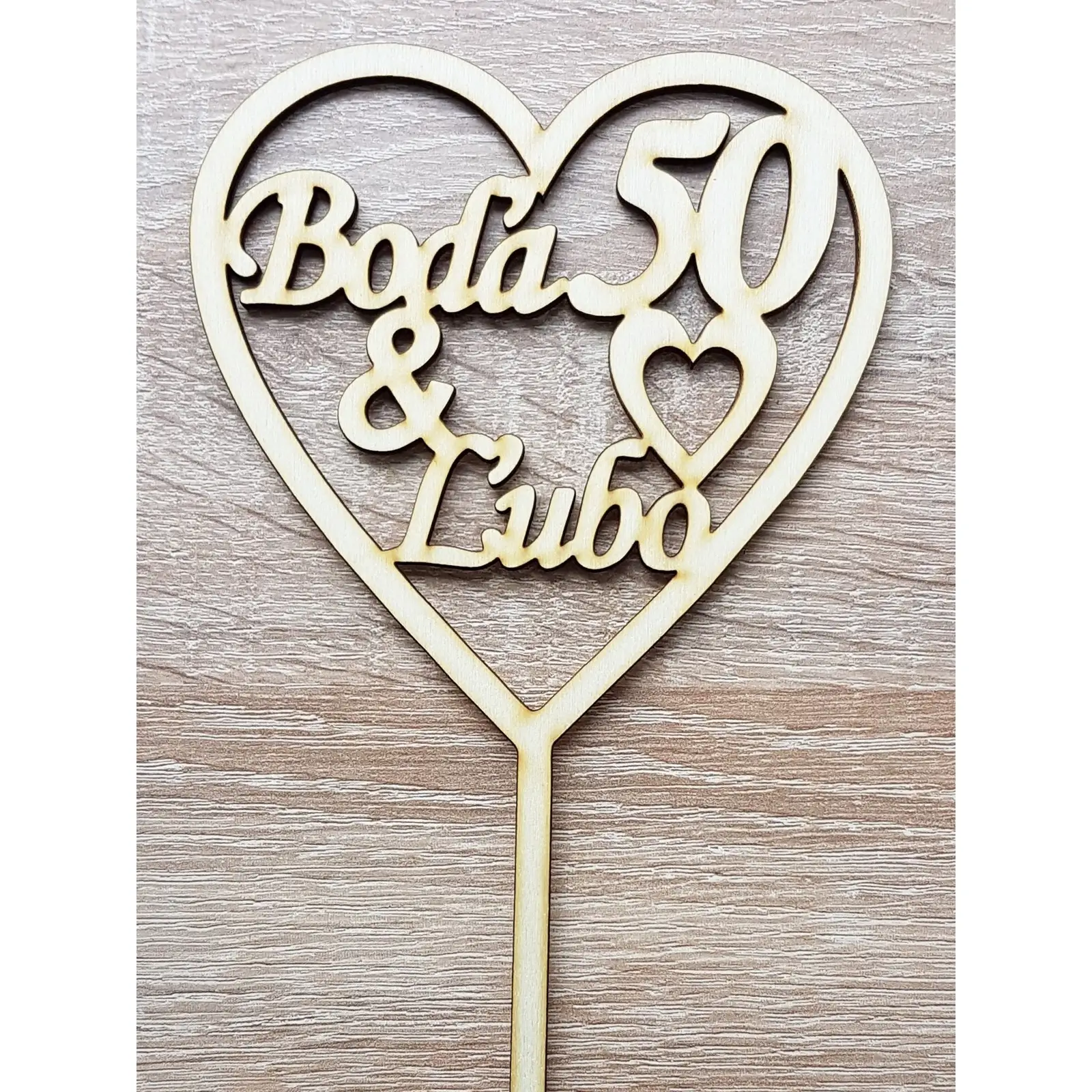 Drevený zápich si môžete nechať vyrobiť na mieru s menami oslávencov, alebo s nápisom "50". Možnosti sú takmer neobmedzené a závisia len od vašej fantázie.
